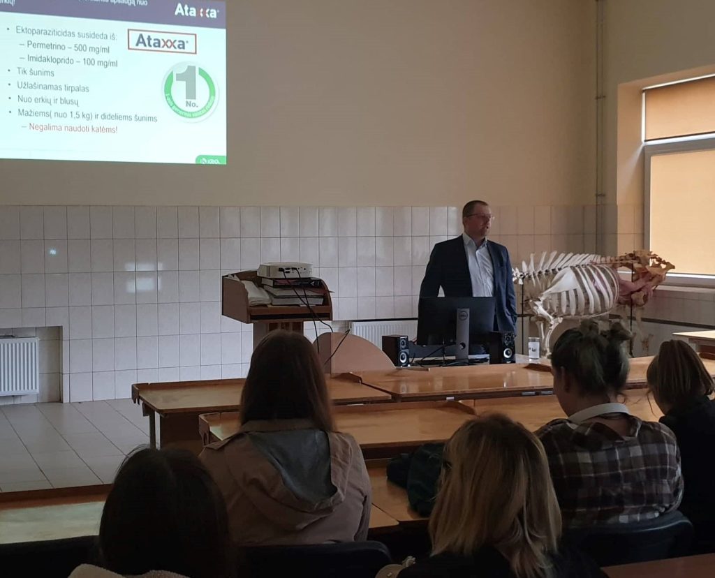 Atšilus orams, visiems gyvūnų laikytojams labai aktualiais tampa klausimai apie augintinių apsaugą nuo erkių, blusų, uodų ir kitų šiltuoju metų laiku šeimininkų ieškančių gyvūnų parazitų. Kad veterinarijos gydytojai ir studentai iš pirmų lūpų sužinotų, kaip tinkamai naudoti ir derinti apsaugos priemones, ką patarti gyvūnų laikytojams, Veterinarinės medicinos katedra pakvietė pasidalinti patirtimi ir naujausia informacija įmonės „Bayer“ atstovą Marių Dragūną ir UAB “KRKA Lietuva” veterinarinių produktų grupės vadovą, veterinarijos gydytoją Liutaurą Domeiką.