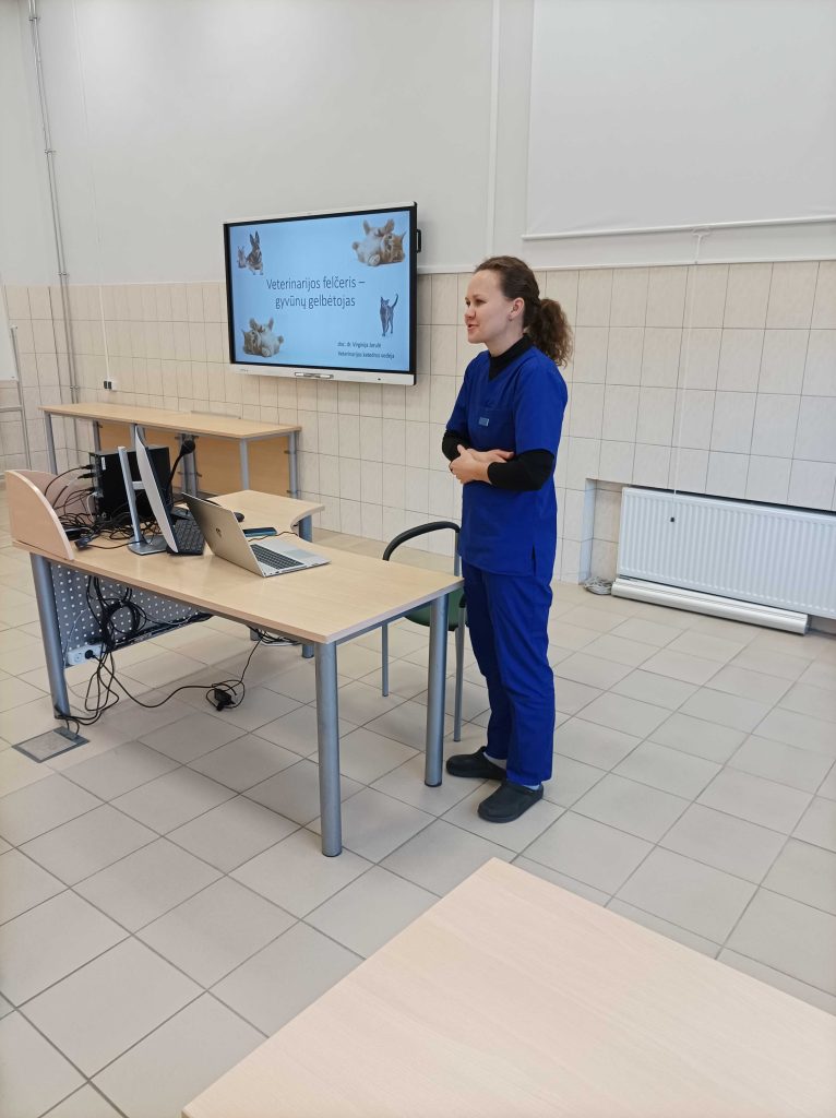 Paskui Veterinarijos klinikos gydytoja Birutė Kryževičienė moksleiviams skaitė paskaitą “Veterinarijos felčeris – gyvūnų gelbėtojas”. Jos metu gydytoja moksleiviams pristatė Veterinarijos studijų programą, papasakojo apie dėstomas disciplinas, absolventų įgyjamas kompetencijas, karjeros galimybes.