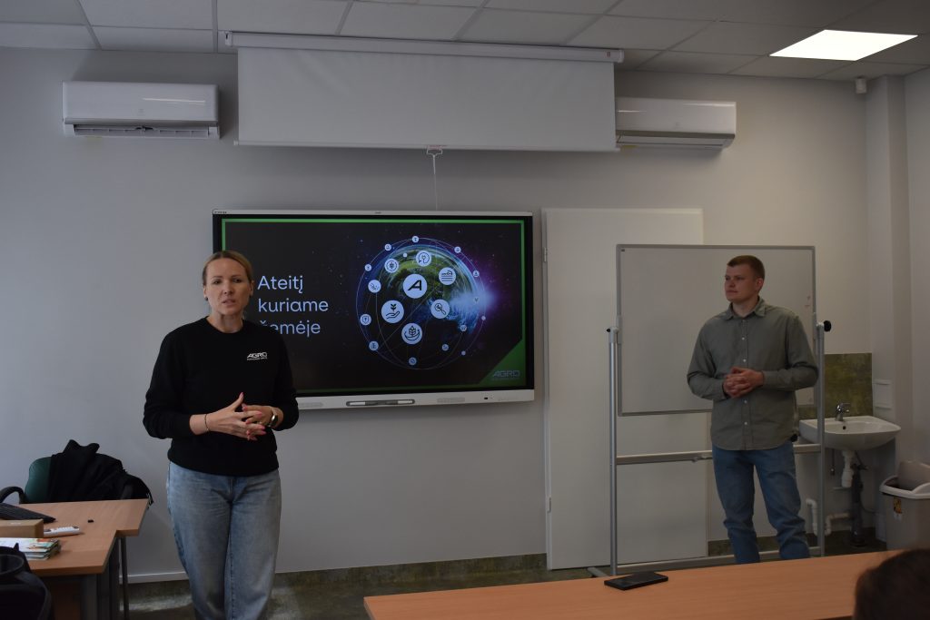 Svečiai studentams pristatė šiuo metu Radviliškio rajone statomą „Ateities ūkį“ – vieną moderniausių ūkių, kuriame bus diegiamos naujos kartos technologijos, įskaitant didžiausią pasaulyje 100 vietų robotizuotą melžimo karuselę iš Švedijos įmonės „DeLaval“, pažangią karvių elgesio analizės sistemą bei lietuvių įmonės „Brolis Sensor Technology“ sukurtą „Brolis HerdLine“ lazerinį pieno analizatorių – ir kitas inovacijas.
