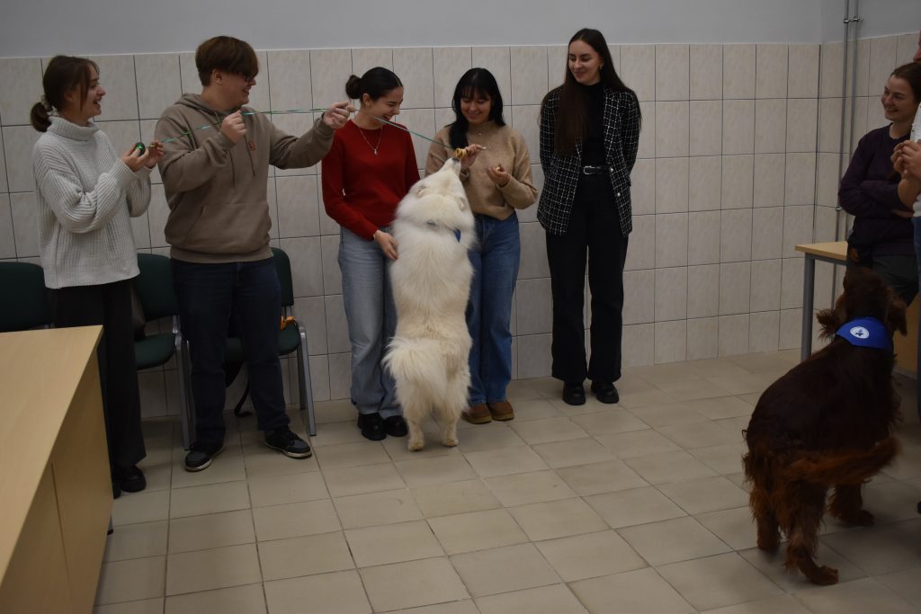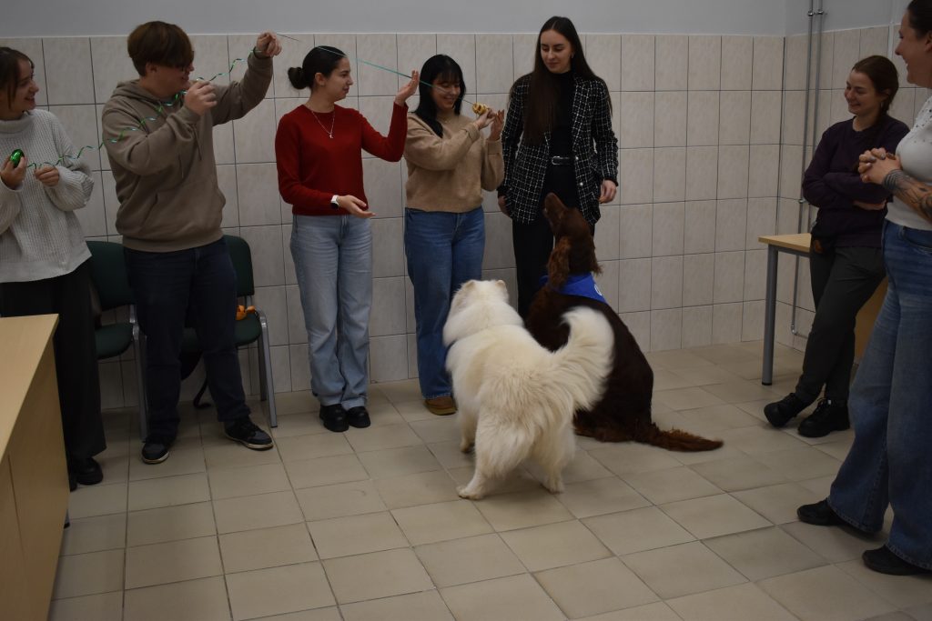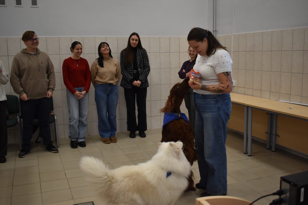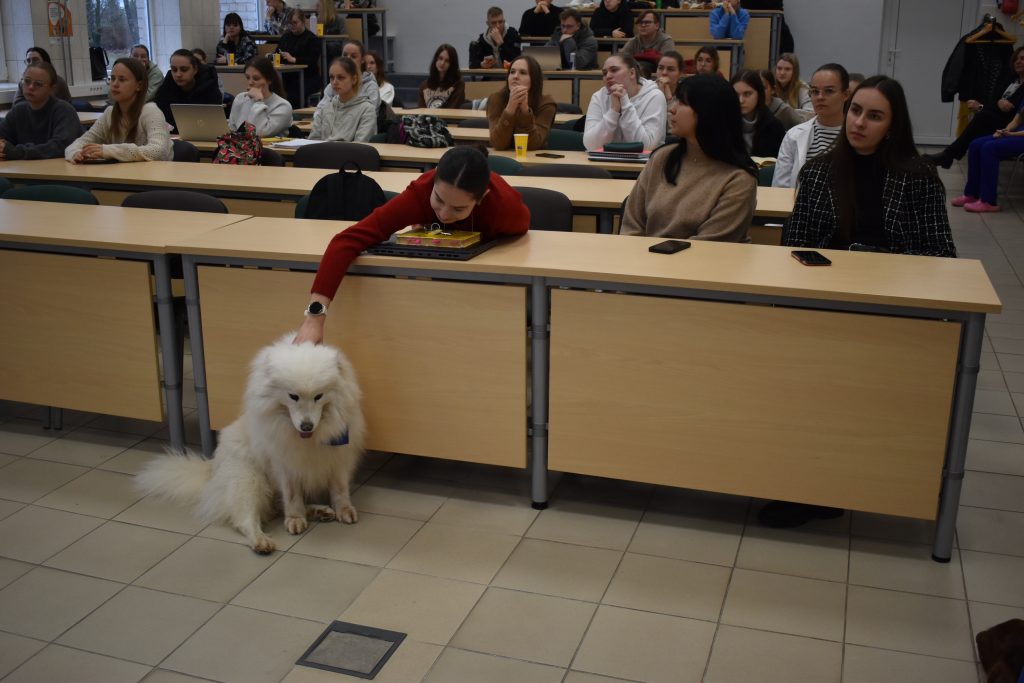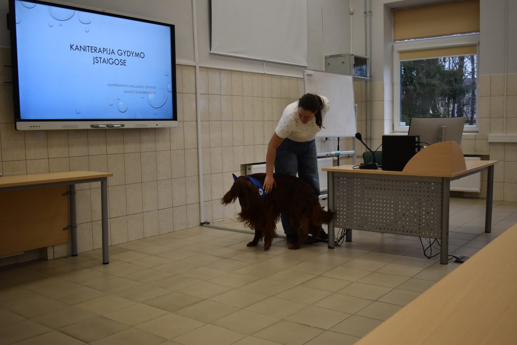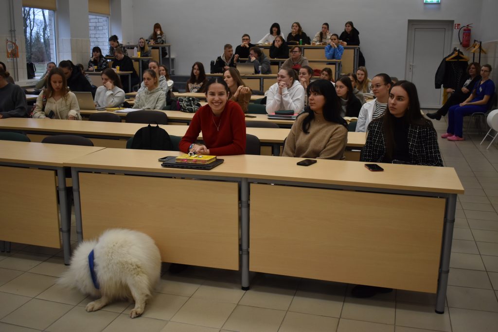 Lapkričio 20 d. Veterinarijos studijų programos studentus aplankė Kaniterapinės pagalbos centro savanorės Skaistė Skibiniauskienė ir Vaiva Kairienė su savo augintiniais Kadabra ir Herakliu. Studentams Skaistė skaitė paskaitą “Kaniterapija – terapija su šunimis. Kiek ji naudinga emocinei ir fizinei sveikatai“. Lektorė supažindino studentus, kas yra kaniterapija, kokie reikalavimai keliami terapiniams šunims, kokią atranką turi praeiti gyvūnai, kad jie ligoninėse galėtų lankyti sunkių ligų diagnozių sulaukusius pacientus. Lektorė papasakojo, kokius fizioterapinius pratimus terapiniai šunys gali padėti atlikti vaikams, senyvo amžiaus žmonėms, žmonėms, sergantiems cerebraliniu paralyžiu, Dauno sindromu. Skaistė taip pat supažindino studentus apie pasaulyje atliekamus mokslinius tyrimus, kurie tyrinėja kaniterapiją, aptarė Lietuvoje galiojančią ir kaniterapiją reglamentuojančią įstatyminę bazę.