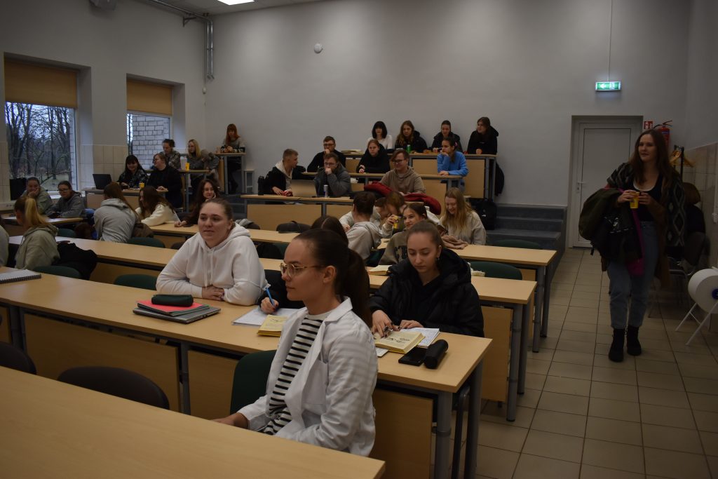Studentai susidomėję klausėsi paskaitos, turėjo lektorei nemažai klausimų.