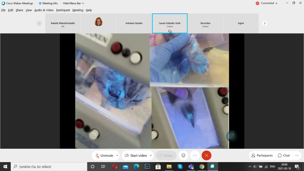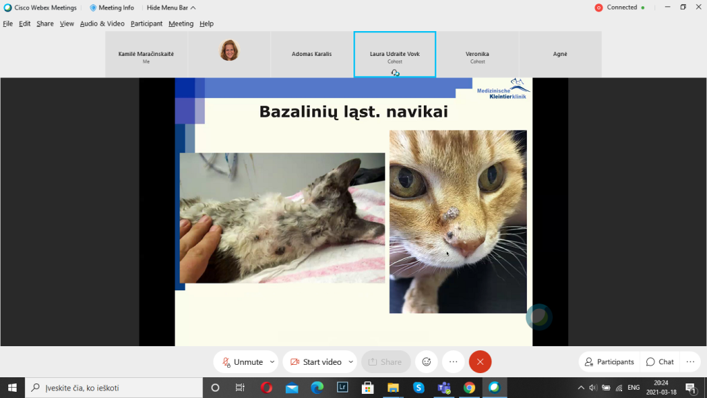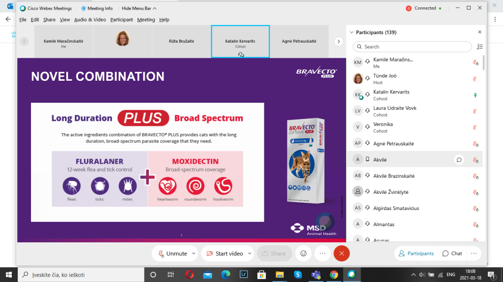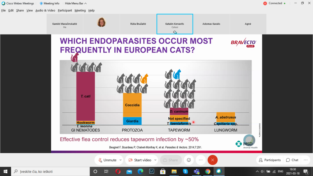 Vilniaus kolegijos Veterinarinės medicinos katedros studentams buvo suteikta unikali galimybė dalyvauti UAB “VETA” , MSD “Animal Health”, LSGVGA bei Veterinarinės medicinos katedros organizuotame nuotoliniame seminare apie smulkiesiems gyvūnams skirtus vaistus nuo parazitų ir kačių odos ligas. Seminaro metu Bulgarijos MSD gyvūnų gerovės verslo padalinio vadovė Dr. Katalin Kervarits papasakojo apie ,,Bravecto’’ vaistų liniją skirtą šunims bei katėms. Šis vaistas pasižymi tuo, jog gydo ir apsaugo nuo išorės ir vidaus parazitų, tokių kaip erkės ir blusos, širdies kirmėlės, apvaliosios kirmėlės, nematodai, bei suteikia net dvylikos dienų apsaugą nuo dalies šių parazitų. Iš pirmo žvilgsnio atrodytų neaktualu girdėti apie šlykščius parazitus, bet net pusė kačių jų turi. Pasak Katalin Kervarits, tyrimų metu paaiškėjo, jog net 30 procentų kačių turi ektoparazitų, 35 procentai – endoparazitų, o 14 procentų turi tiek vidinių, tiek išorinių parazitų. Taip pat buvo įdomu išgirsti, koks yra vaisto efektyumas gydant juo skirtingų rūšių parazitus. Tiriant apvaliosiomis kirmelėmis ir nematodais apsikrėtusas kates nustatyta, jog vaisto efektyvumas siekia 99,77%, gydant T. Cati apsikrėtusias kates, 98,3%. Vaistas 100% gydo kates nuo širdies kirmėlių, kurias itin sunku diagnozuoti ir suteikia net 30 dienų apsaugą nuo šių kirmėlių lervų patekimo į katės organizmą. Kalbant apie itin užkrėčiamas ausų erkes, kurios net puse atvejų sukelia išorinės ausies uždegimą, naudojant šį vaistą, per keturioliką dienų gyvūnai nuo jų buvo visiškai išgydyti. Svarbu, kad vienas vaistas gali paveikti daug skirtingų parazitų rūšių, bet tuo pačiu nesukelia itin sveikatai pavojingo šalutinio poveikio, nors kačių odos ligų gydymas sudėtingas. Skirtingos kačių odos parazitų rūšys nesirenka išskirtinai tik joms būdingų katės kūno sričių. Tai savo pranešimo pradžioje minėjo veterinarijos gydytoja-dermatologė Laura Udraitė Vovk. ,,Šeimininkai turėtų žinoti, jog nebus taip, kad vos pamatę žaizdą ar nusišėrusį kailį žinosime, kaip gyvūną teisingai gydyti’’. Laura Udraitė Vovk mokė mus strategijos, kaip teisingai atpažinti ligos sukėlėją. Ji minėjo, jog reikia pradėti nuo klausimų šeimininkui. Svarbu paklausti ar katinas kasosi, gal laižosi dažniau nei įprastai. Taip pat svarbu žinoti ar niežulio nejaučia kiti šeimos augintiniai ir patys šeimininkai, nes kai kurios odos ligos gali būti zoonotinės. Visi šie atsakymai į klausimus padeda susiaurinti galimų ligos sukėlėjų sąrašą. Tokios paskaitos naudingos, nes mes gavome teorinių ir praktinių žinių, kurios tikrai pravers mūsų darbe.